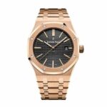 The Audemars Piguet Royal Oak 15500OR.OO.1220OR.01 Replica is a luxury watch crafted with 904L stainless steel in a rose gold color. The case is 41.00 mm in size and features a sapphire crystal. The bracelet is also crafted from 904L stainless steel and is adjustable for all sizes. The dial is black with a stick. dot indices. and Royal Oak hour markers.