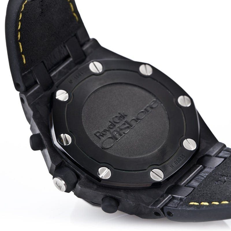 This Audemars Piguet Royal Oak Offshore Replica. model number 26176FO.OO.D101CR.02. is a 1:1 super clone Swiss mechanism watch. It features an automatic movement with a caliber of AP 3126 / 3840 and a power reserve of 60 hours. The case is made of 904L stainless steel and is black in color. The bezel is also made of 904L stainless steel and is black in color. and the crystal is sapphire. The bracelet is made of crocodile leather with yellow contrast stitching. and the clasp is a deployment clasp made of 904L stainless steel.