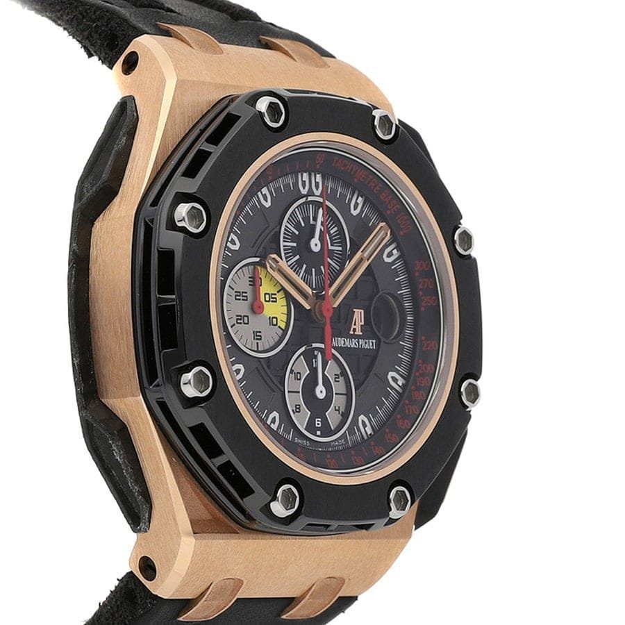 The Audemars Piguet Royal Oak Offshore Replica is a 1:1 super clone Swiss mechanism watch. It features a 904L stainless steel case with a black bezel and a sapphire crystal. The 44.00 mm case is 15.7 mm thick and is available in pink gold. The black rubber bracelet is adjustable and features a 904L stainless steel AP folding clasp in pink gold.