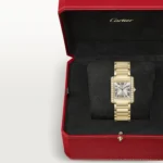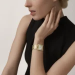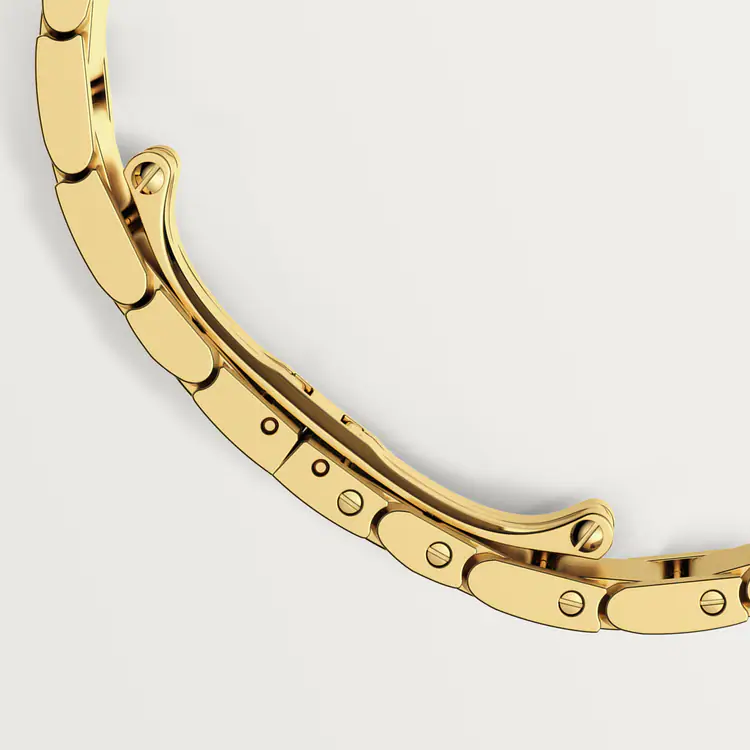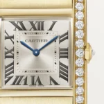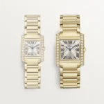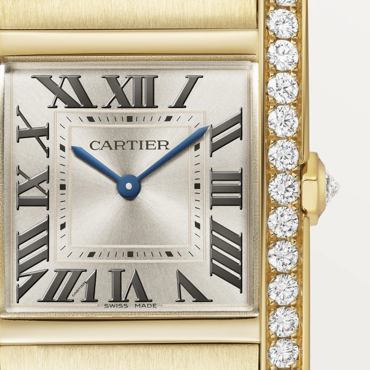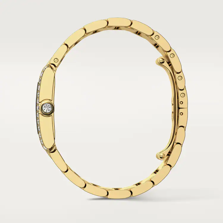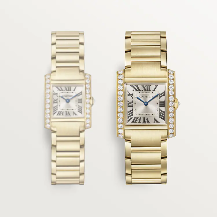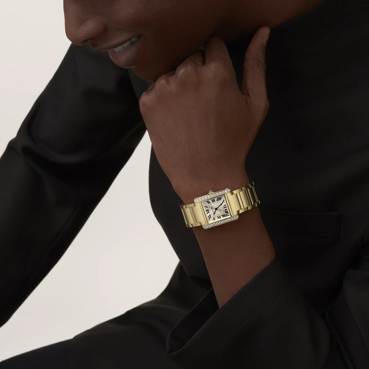 Tank Française watch, medium model, quartz movement. Case and faceted crown in 18K yellow gold (750/1000) set with 27 brilliant-cut diamonds totaling 1.22 carats. Golden sunray dial, blued-steel sword-shaped hands, sapphire crystal. Bracelet in 18K yellow gold (750/1000). Case dimensions: 32 mm x 27 mm, thickness: 7.1 mm. Water-resistant up to 3 bar (approx. 30 meters/100 feet).