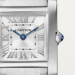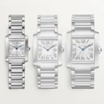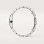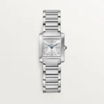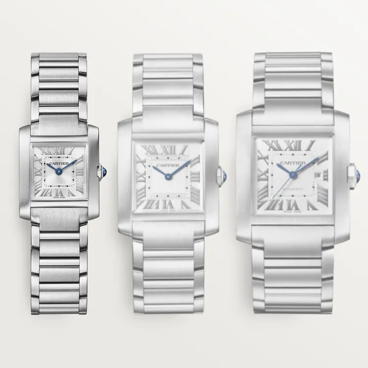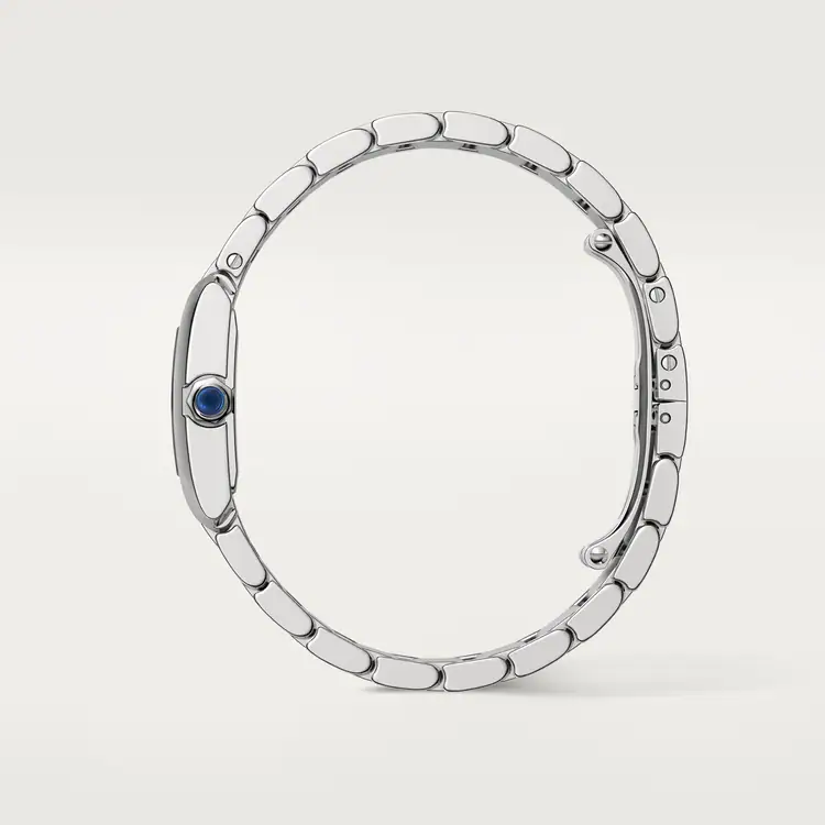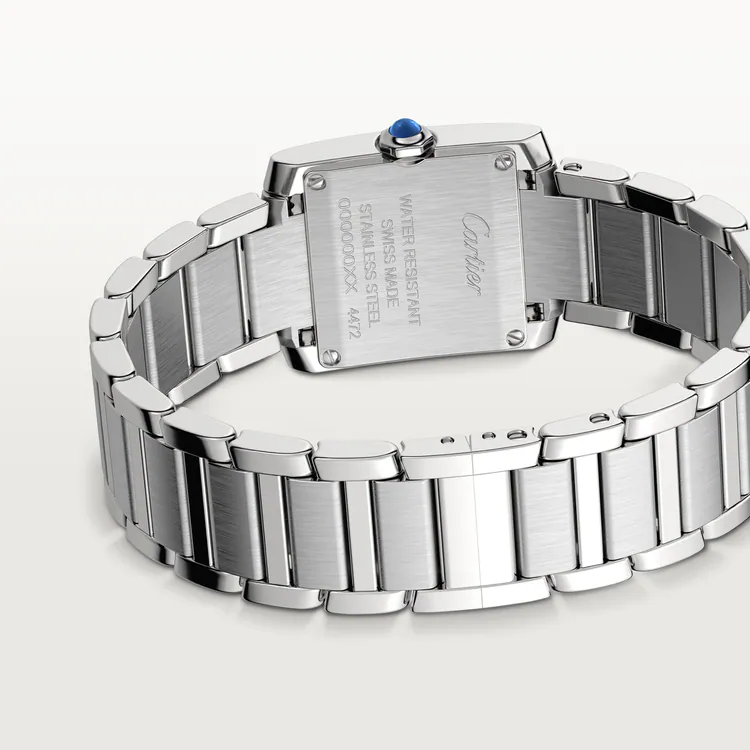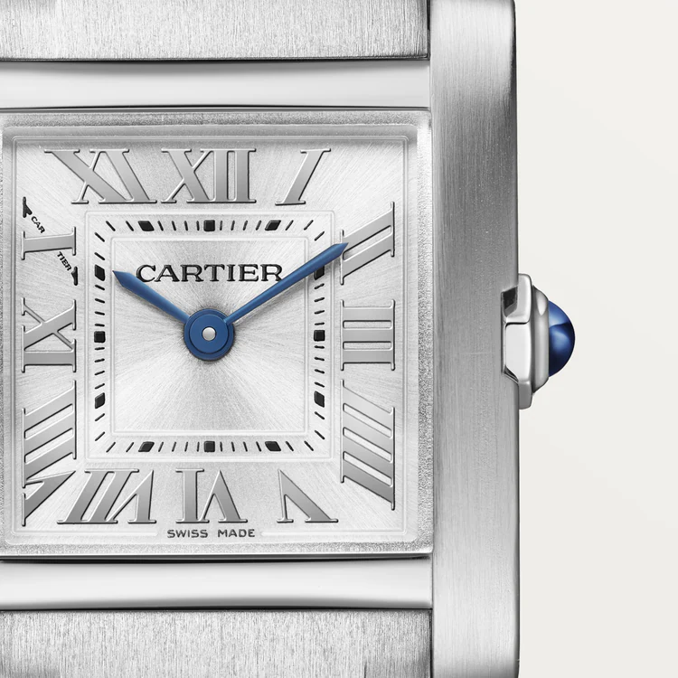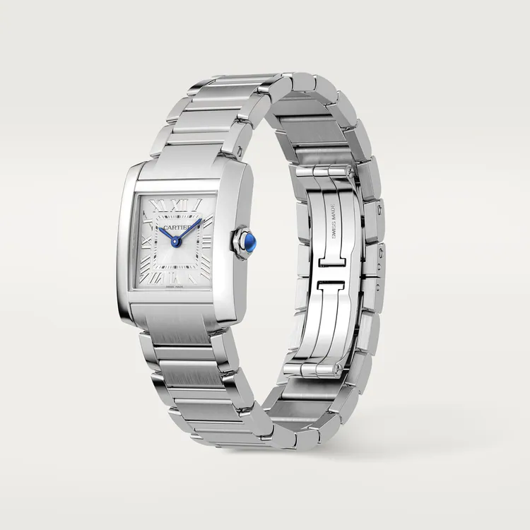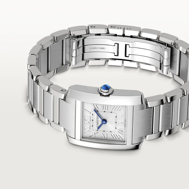 ank Française watch, small model, quartz movement. Steel case. Faceted crown in steel decorated with a synthetic cabochon-shaped spinel. Silvered sunray dial, blued-steel sword-shaped hands, sapphire crystal. Steel bracelet. Case dimensions: 25.7 mm x 21.2 mm, thickness: 6.8 mm. Water-resistant up to 3 bar (approx. 30 meters/100 feet).