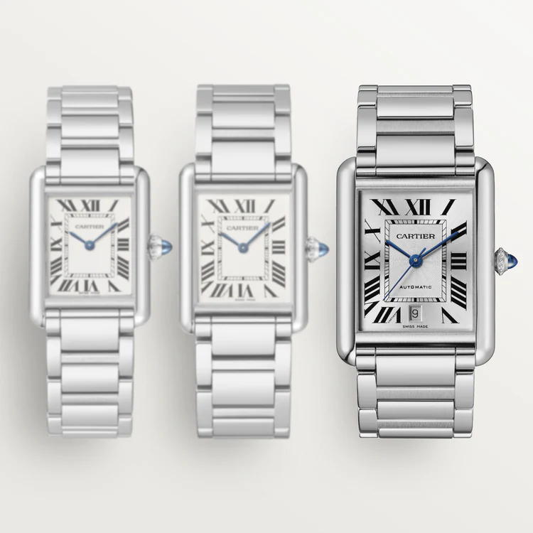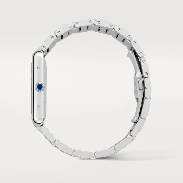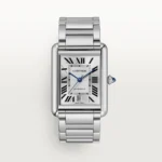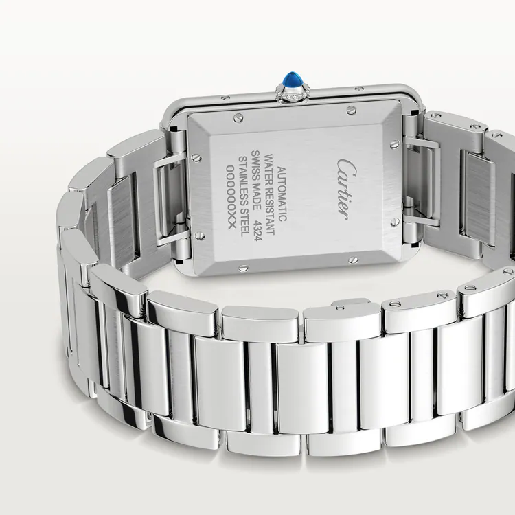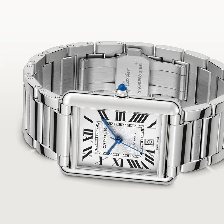 Tank Must watch, extra-large model, mechanical movement with automatic winding, caliber 1847 MC. Steel case, beaded crown set with a synthetic cabochon-shaped spinel, silvered flinqué dial, blued-steel sword-shaped hands, steel bracelet, calendar aperture at 6 o’clock. Case dimensions: 41 mm x 31 mm, thickness: 8.4 mm. Water-resistant up to 3 bar (approx. 30 meters/100 feet).