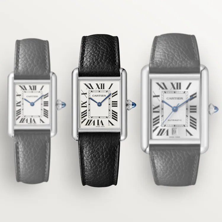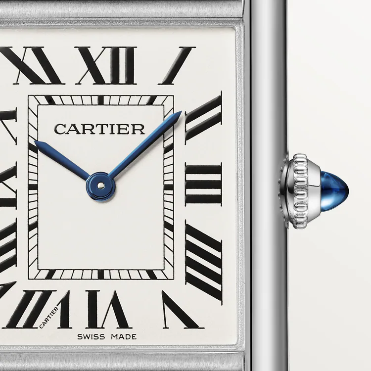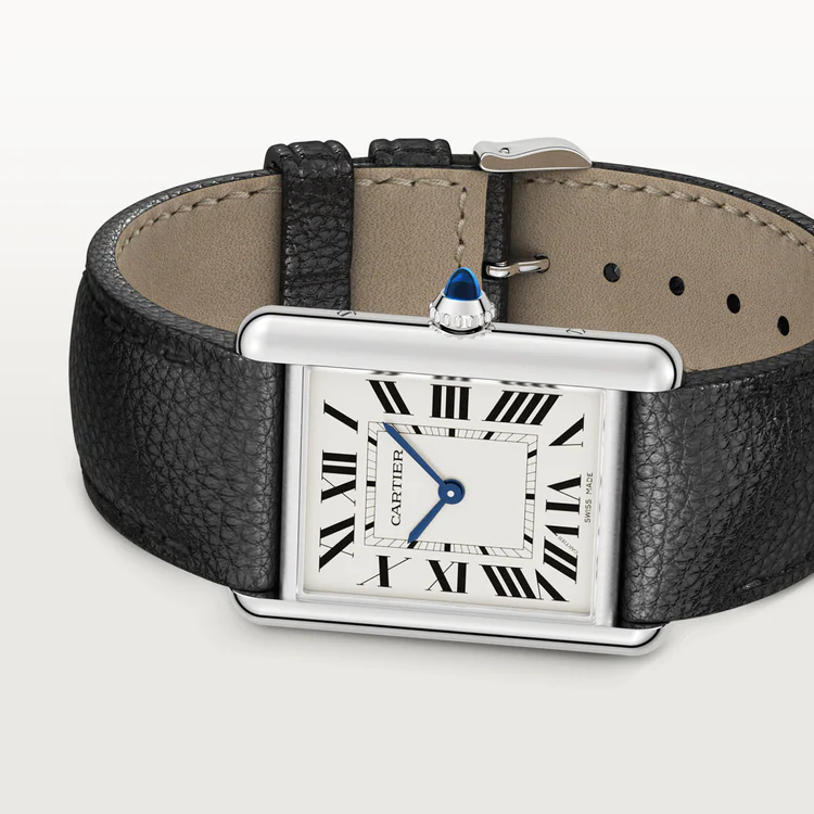 Tank Must watch, large model, high autonomy quartz movement. Steel case, beaded crown set with a synthetic cabochon-shaped spinel, silvered dial, blued-steel sword-shaped hands, interchangeable black grained calfskin strap, steel ardillon buckle. Case dimensions: 33.7 mm x 25.5 mm, thickness: 6.6 mm. Water-resistant up to 3 bar (approx. 30 meters/100 feet).