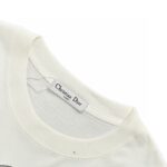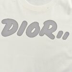 This Dior t-shirt features a bold oversized Dior logo in grey on the front. The shirt is primarily white. offering a relaxed fit with short sleeves and a high neck. Perfect for adding a statement piece to your casual wardrobe while staying comfortable.