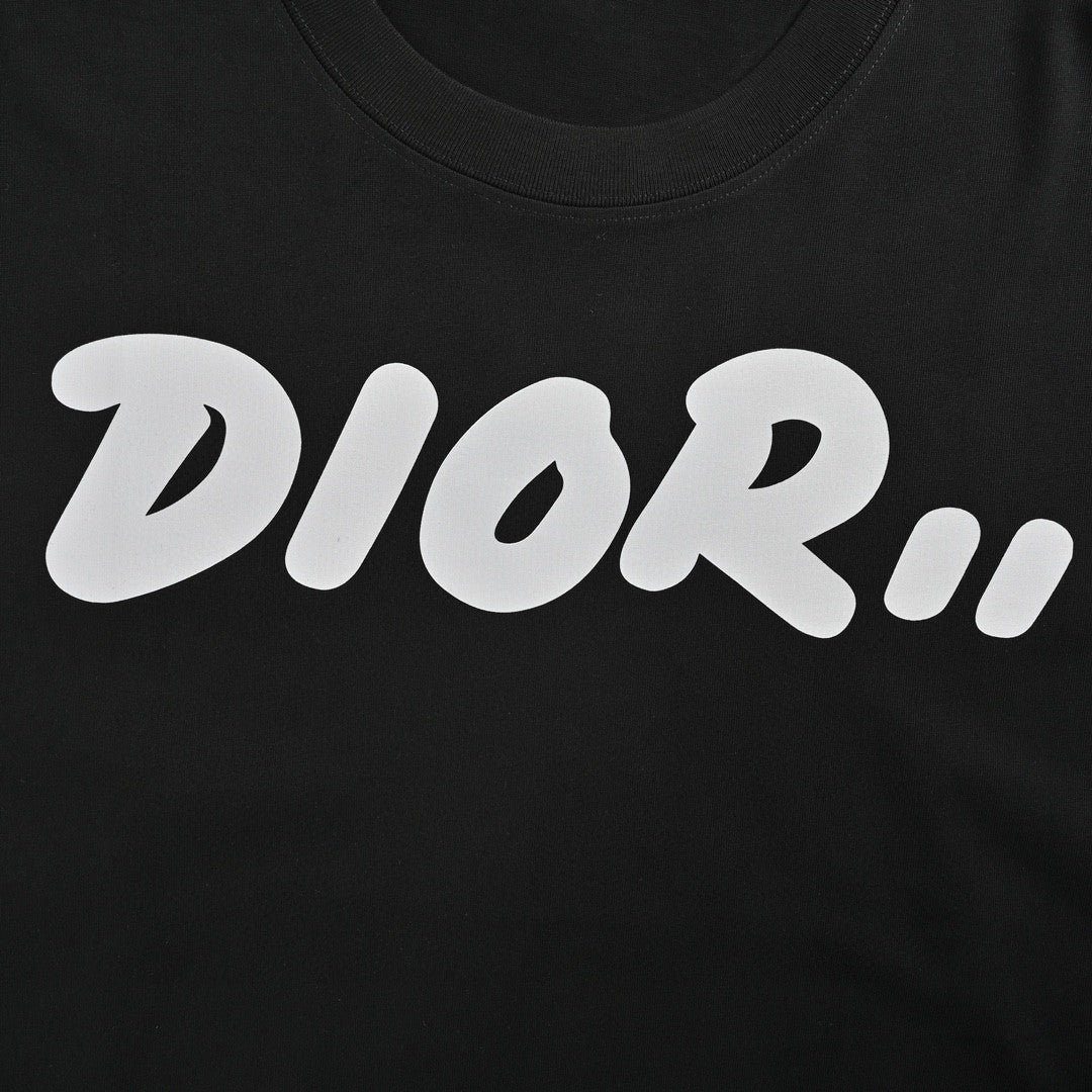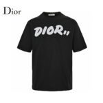 This Dior t-shirt features a bold oversized Dior logo in white on the front. The shirt is primarily black. offering a relaxed fit with short sleeves and a high neck. Perfect for adding a statement piece to your casual wardrobe while staying comfortable.