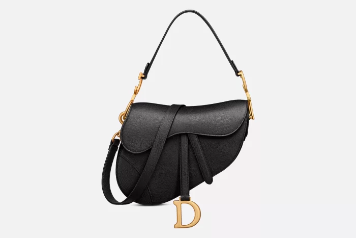 Maria Grazia Chiuri brings a fresh update to the iconic Saddle bag. Crafted in black grained calfskin, the legendary design features a Saddle flap with a D stirrup clasp on a magnetic strap, as well as an antique gold-finish metal CD signature on either side of the strap. Equipped with a thin, adjustable and removable shoulder strap, the Saddle bag may be carried by hand, worn over the shoulder or crossbody.