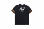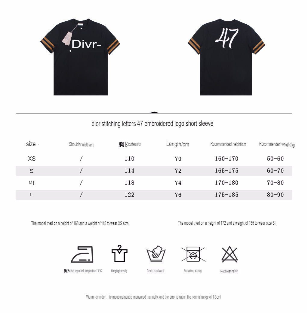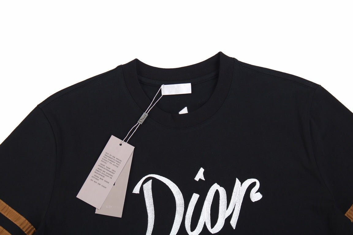 This Dior t-shirt features the brand’s name in a bold script logo across the chest in white. The t-shirt is black. providing a sleek backdrop for the logo. Additional design elements include double brown stripes on the sleeves. Made from high-quality materials. it offers both comfort and style. Perfect for a chic and casual outfit.