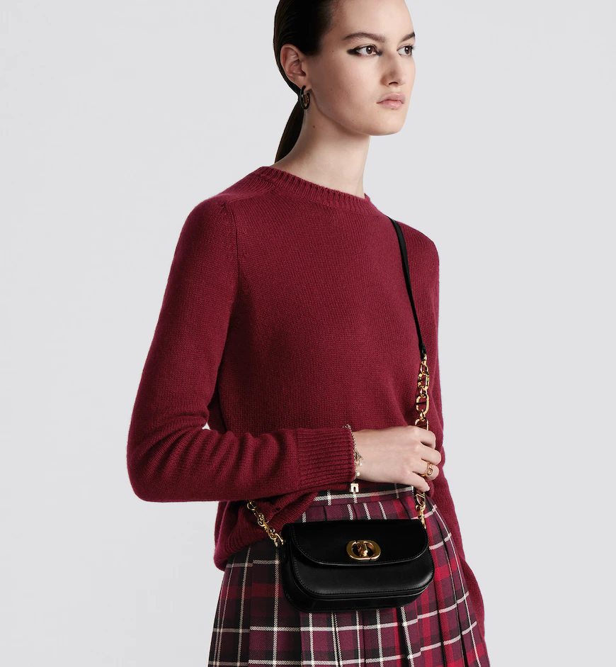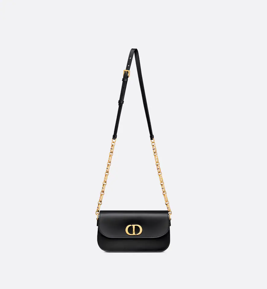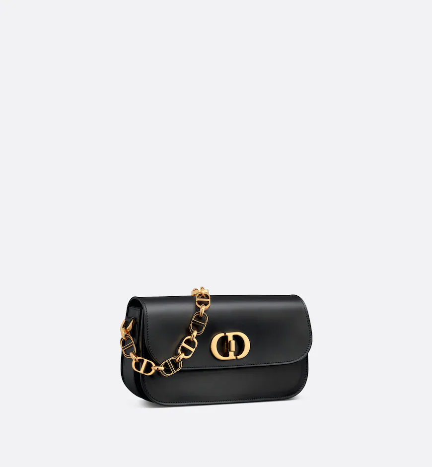 The 30 Montaigne Avenue bag enhances the hallmark line with a timeless and elegant shape. Crafted in black box calfskin, the rounded flap with delicate curves is punctuated by an antique gold-finish metal CD twist clasp inspired by the seal of a Christian Dior perfume bottle. The design is completed by other details, like the 30 Montaigne signature embossed on the back and the signature chain alternating gold-finish metal and tonal enamel links that match the leather. The small, gusseted bag features a refined silhouette that can be carried by hand, worn over the shoulder or crossbody.