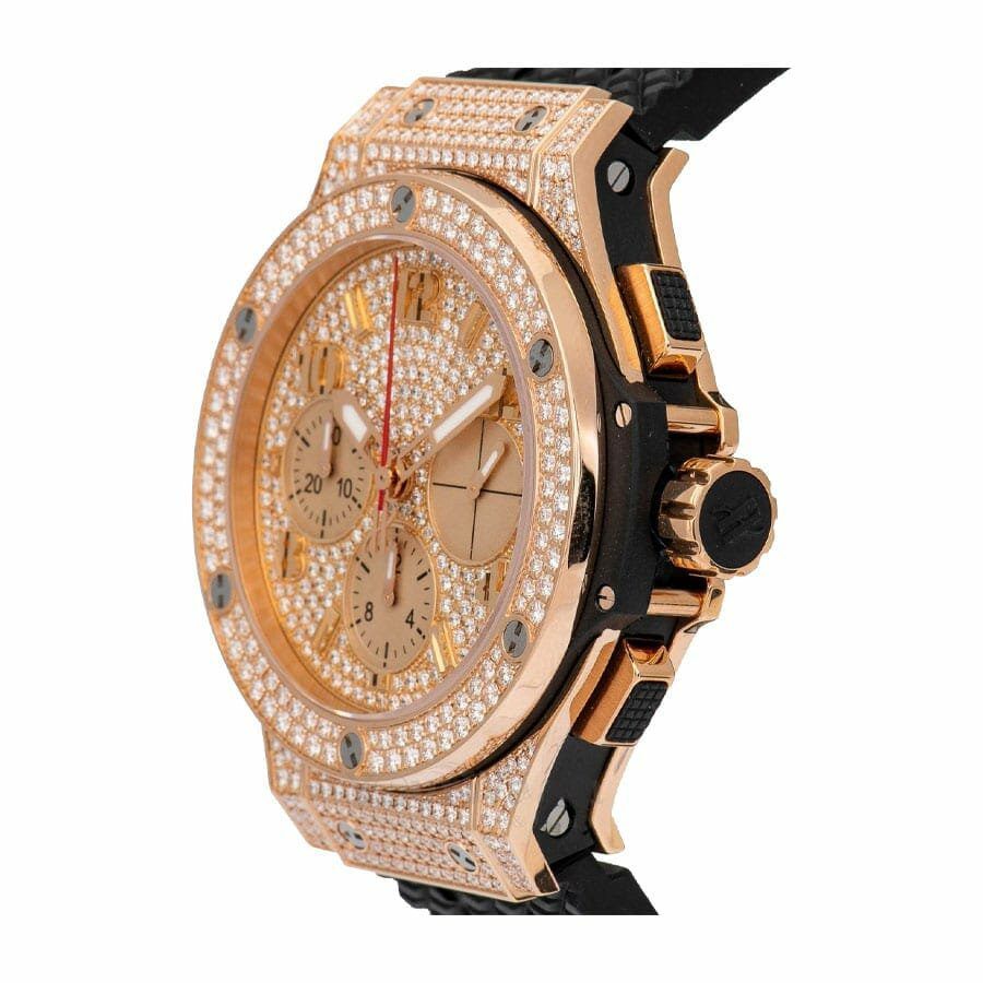 The bracelet is made of rubber and is black in color. It is adjustable for all sizes and has a 904L stainless steel fold clasp. The dial is also rose gold and gem-set in color with mixed indeces and 904L stainless steel stick hour markers and hands. It has the functions of hours. minutes. seconds. date. and chronograph. It has passed the 30m water resistance test and is under the protection of a full 2 years International United Luxury warranty. It is a perfect replica of the authentic watch and even your jeweler won’t be able to tell the difference.