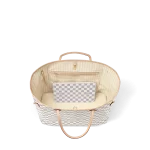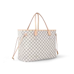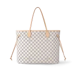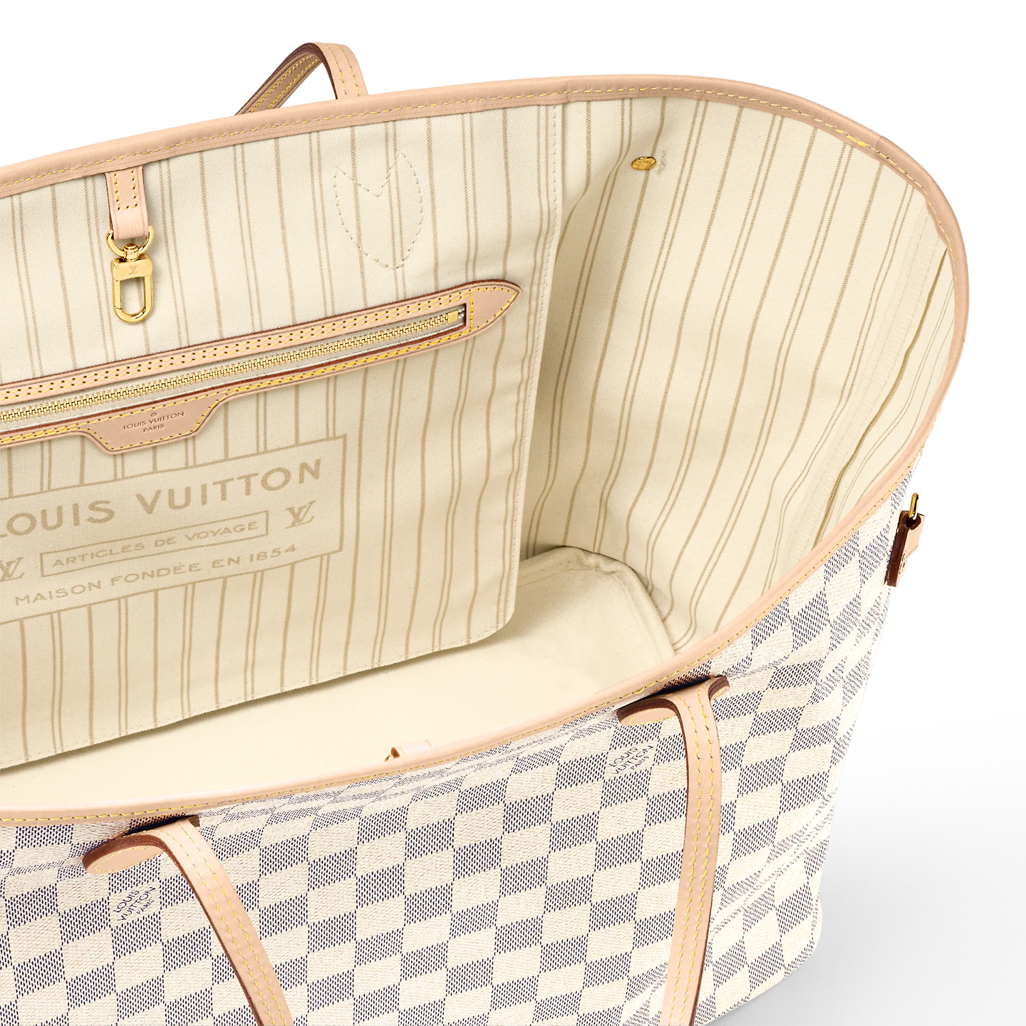 The Neverfull GM tote unites timeless design with heritage details. Crafted from fresh Damier Azur canvas with natural cowhide trim. it is ultra-roomy yet never bulky. with side laces that cinch for a sleek allure or loosen for a more casual look. Slim. comfortable handles slip easily over the shoulder or arm. Lined in colorful textile. it features a removable pouch which can serve as a clutch or an extra pocket.