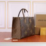 The Onthego medium handbag features classic Monogram canvas and Monogram Reverse canvas on both sides, presenting different styles. Toron dual handles and shoulder straps allow for a variety of carry options.