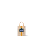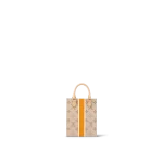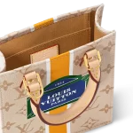 Made from beige Monogram canvas with a textile-like printed effect, the Petit Sac Plat is decorated with a vertical white-and-ocher stripe. In the center of the bag is what looks like a typical Parisian street-sign, featuring the words “Louis Vuitton Paris.” In addition to the two rolled-leather top handles, there’s a removable and adjustable strap.