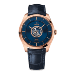 The Omega De Ville Trésor Tourbillon Sedna Gold / BlueReplica is a luxurious watch with a unique design. It features a 904L stainless steel case with a rose gold finish and a sapphire crystal. The movement is an automatic caliber 2638 with a power reserve of 60 hours and a precision of -3/+3 seconds per day within COSC certification limits. The second hand has a sweep motion. The bracelet is made of leather with adjustable links and a 904L stainless steel fold clasp in silver.