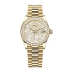 This Rolex Datejust 278288RBR-0011 Yellow Gold And Diamond Automatic Mother Pearl Butterfly Dial Oyster Replica is a high quality watch. It features a 904L stainless steel case with a yellow gold color and a gem-set bezel. The sapphire crystal is 31.00mm in size and the movement is an automatic caliber 2236 with a 60-hour power reserve and a sweep motion second hand. The bracelet is a 904L stainless steel oyster with adjustable links and a fold clasp in yellow gold. The dial is a white mother pearl butterfly with gem-set indices and 904L stainless steel hands.