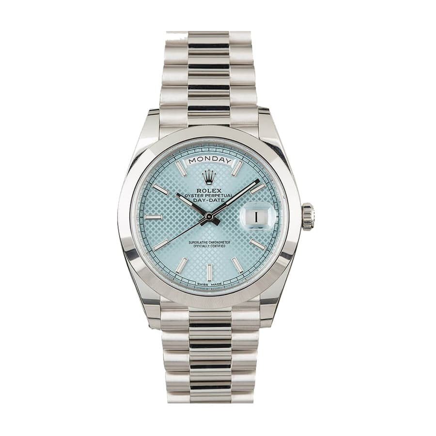 The Rolex Day-Date 40 Ice Blue Diagonal Dial Platinum President 228206-0004 Replica showcases a magnificent 904L stainless steel case paired with a steel bezel and topped with sapphire crystal. offering durability and a mirror-like finish that radiates brilliance with every movement. The automatic caliber 3255 at its core delivers a power reserve of 60 hours while maintaining precision within (-3/+3 sec/day). adhering to COSC certification standards. Imagine glancing at the ice blue diagonal motif dial. where stick and dot indices stand out prominently against the cool-toned background. easily legible and impeccably designed. The 904L stainless steel hands move gracefully. reflecting light with a subtle shimmer that is both mesmerizing and functional.