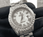 The Rolex Day-Date II Diamond Replica features a pristine white dial. adorned with elegant Roman numeral hour markers and sleek stick hands made from high-quality 904L stainless steel. The adjustable links on the gem-set stainless steel bracelet ensure a perfect fit for any wrist size. while the folding clasp provides security and ease of use. Equipped with both automatic and quartz movements. this timepiece offers reliability and precision. with a power reserve of approximately 60 hours. With a water resistance rating of up to 30 meters. this watch is designed to withstand everyday activities while maintaining its allure. Backed by a full 2-year international warranty. the Rolex Day-Date II Diamond Replica is a true symbol of excellence and refinement. meticulously crafted to rival the authenticity of the original.