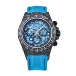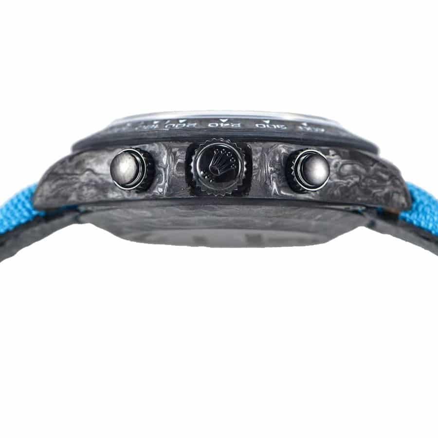 This Rolex Daytona Cosmograph Automatic Blue Sun Flower Pattern Dial Replica is a perfect 1:1 clone of the original. It features a 904L stainless steel case with a forged carbon color. a sapphire crystal. and a 40.00 mm size and 15.00 mm thickness. The bracelet is made of fabric with adjustable links and a 904L stainless steel pin buckle clasp in blue and black.