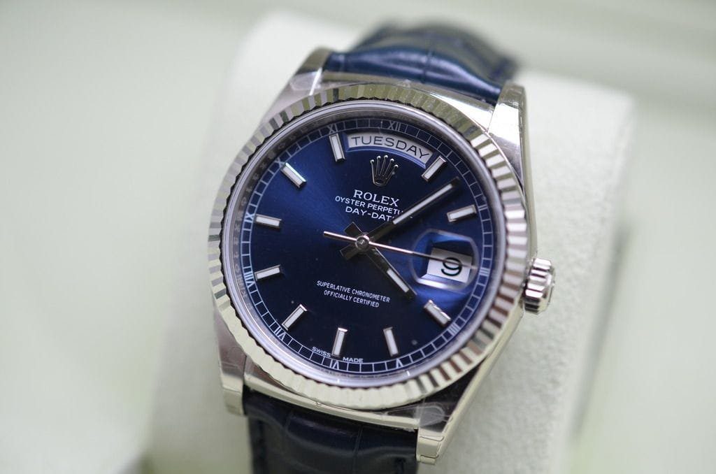 This Rolex Day-Date 118139-0004 V5 Stainless Steel Blue Dial Replica is a stunning watch. It features a 904L stainless steel case and bezel. with a white gold color. The sapphire crystal is 36.00 mm in size and the crocodile bracelet is adjustable for all sizes. The blue dial has stick and dot indices. with 904L stainless steel stick hands and hour markers.