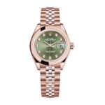 This Rolex Lady-Datejust 279165-0011 Everose Gold Automatic Green With Diamond Dial Jubilee Replica is a high quality watch. It features a 904L stainless steel case in rose gold. with a sapphire crystal and a 904L stainless steel bezel in rose gold. The jubilee bracelet is also made of 904L stainless steel and is adjustable for all sizes. The dial is nicknamed Olive and is green with gem-set indices. The hour markers are made of 904L stainless steel and are gem-set. and the hands are made of 904L stainless steel and are stick.